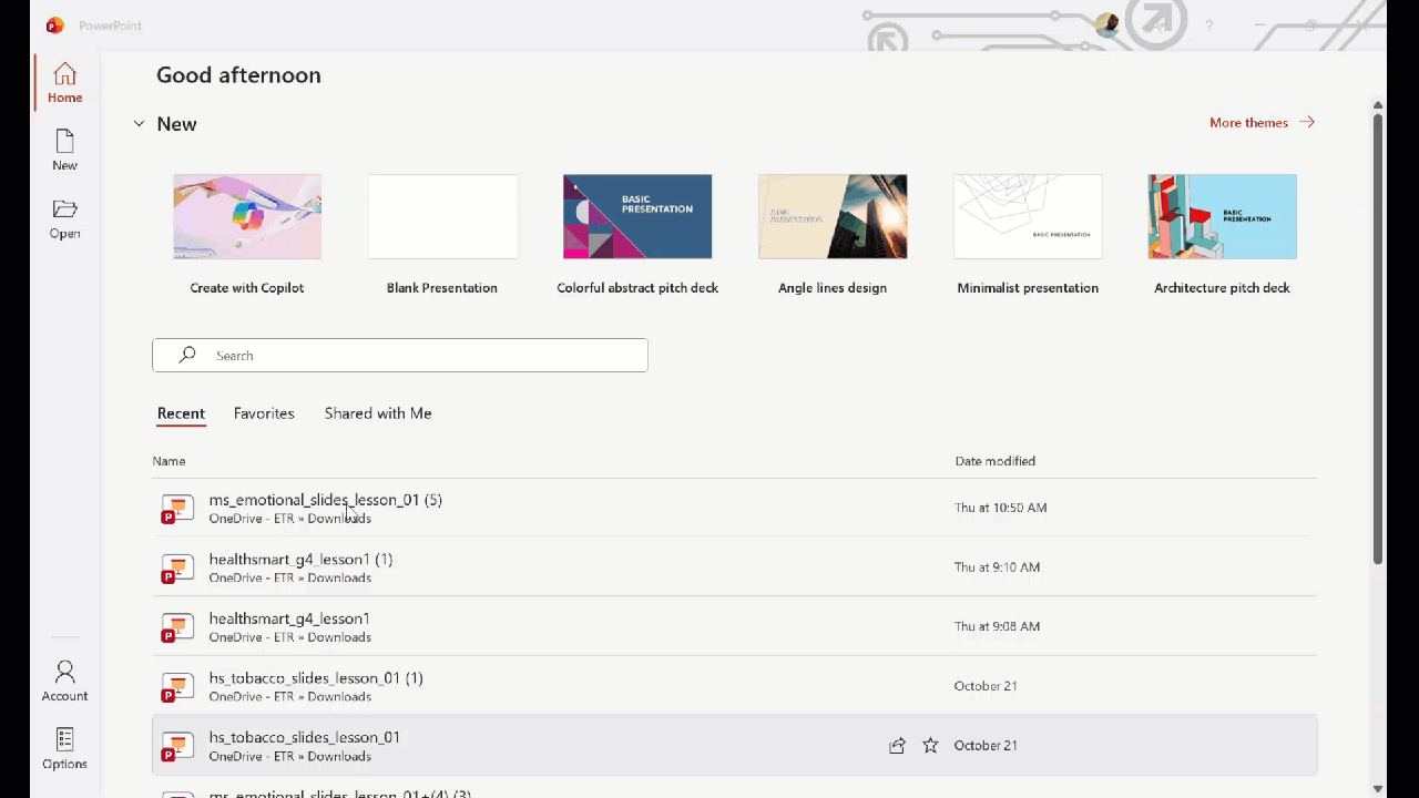 - Open Microsoft PowerPoint. When it opens, you'll land on the welcome screen where you can see various templates and your recent files. From there, simply choose the HealthSmart lesson slides you've downloaded.