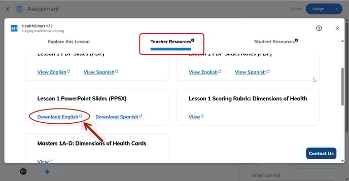 - Begin by going to a Lesson page, then select Teacher Resources. Click either "Download English" or "Download Spanish" under the Lesson PowerPoint Slides (PPSX) box.